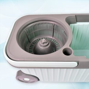 - The mop bucket comes with a wringer that allows you to easily press excess water out of the wet mop, without using your hands. Offers convenient soap dispenser for adding liquid soap easily to the water.