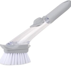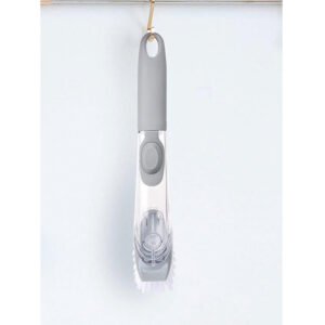 Kitchen scrub brush is equipped with super-large-capacity dispenser, and dispenses soap on demand with the light push of a button. No matter how placed, the silicone valve can prevent the dish soap from leaking