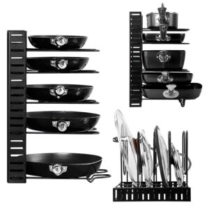 - This rack comes in a sleek black color that is sure to complement any kitchen decor. The 5 shelves offer ample storage space for all your cooking essentials, keeping your kitchen organized and clutter-free. This Adjustable Multipurpose Pan and Pot Tawa Rack Holder Stand is the perfect size for use in your kitchen cabinet or pantry. It’s designed to fit snugly on your shelves, maximizing your storage space.