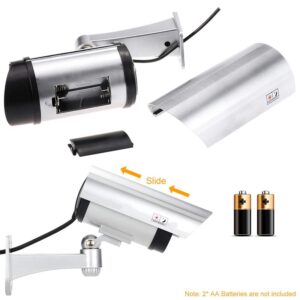 The case of the fake security camera is designed to be waterproof so that it can still work normally on rainy days. After putting 2 sets of AA batteries inside the battery compartment, the LED flashing light will start to blink and it will flicker at 1-2 seconds intervals. With 12 screws, it is easy to install on the corner of the wall or on the ceiling.